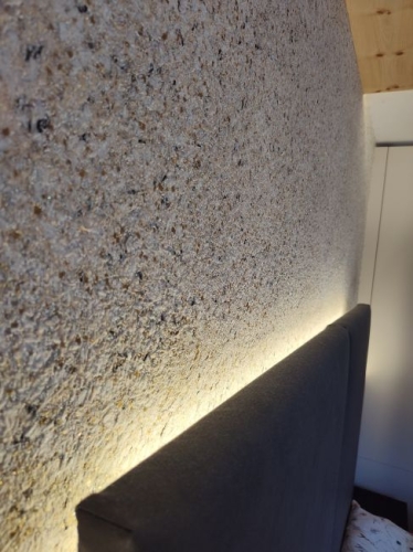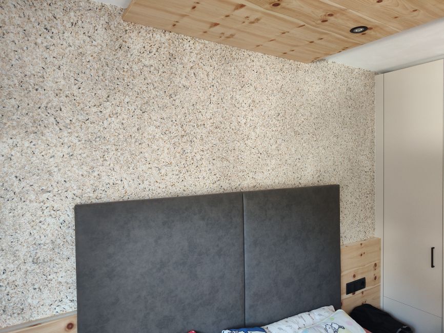 Lo strato applicato di 1-2 mm agisce come un maglione che copre le pareti. A differenza di altri rivestimenti murali, però, le pareti in cotone rimangono aperte alla diffusione e traspiranti. Un chiaro vantaggio per il clima interno, soprattutto negli scantinati o nei vani scala.